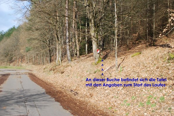 Start des Laufes ist am Sonntag, den 06.04.2014 um 7:30 Uhr. Treffpunkt ist der Parkplatz an der L486 etwa 1,6 Km von Salzwoog kommend Richtung Lemberg/Pirmasens. Gegenüber ist der Abzweig der L485 nach Langmühle/Eppenbrunn. An dem Parkplatz befindet sich das Schild mit dem genauen Startort an einer Buche.