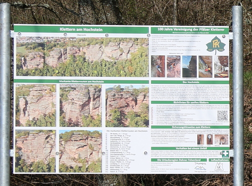 Die Tafel zeigt neben einer Übersicht über den Hochstein nebst einer Auswahl der wichtigsten Klettertouren, etwas über die Klettergeschichte des Felsens und der PK, Hinweise zur Sicherheit beim Klettern in der Pfalz, auch einen Verweis auf die Richtlinien zum sanften Klettern .