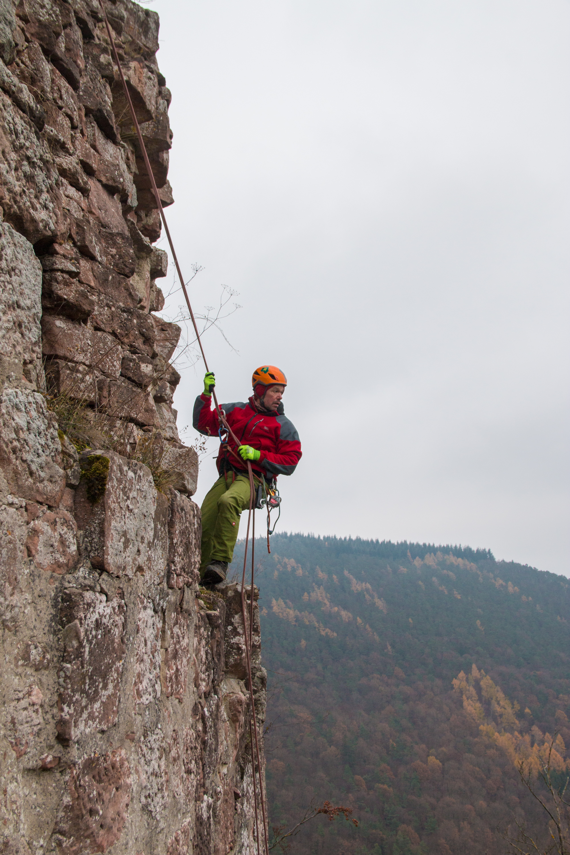 Da dies eine für uns etwas ungewohnte, aber interessante Anfrage war, fanden sich schnell vier Freiwillige, um die Arbeiten gleich an diesem Sonntag (29.11) durchzuführen. Wann darf man denn schließlich schon mal auf Burgmauern herumklettern und das Ganze noch für einen guten Zweck? Zudem liegt es auch in unserem Interesse, dass die Burgruinen im Pfälzerwald zugänglich sind, auch wir Kletterer besuchen gerne mal eine der tollen Burgruinen bei uns im Wald und wir unterstützen deshalb gerne den Verein, der sich um die Burg kümmert.